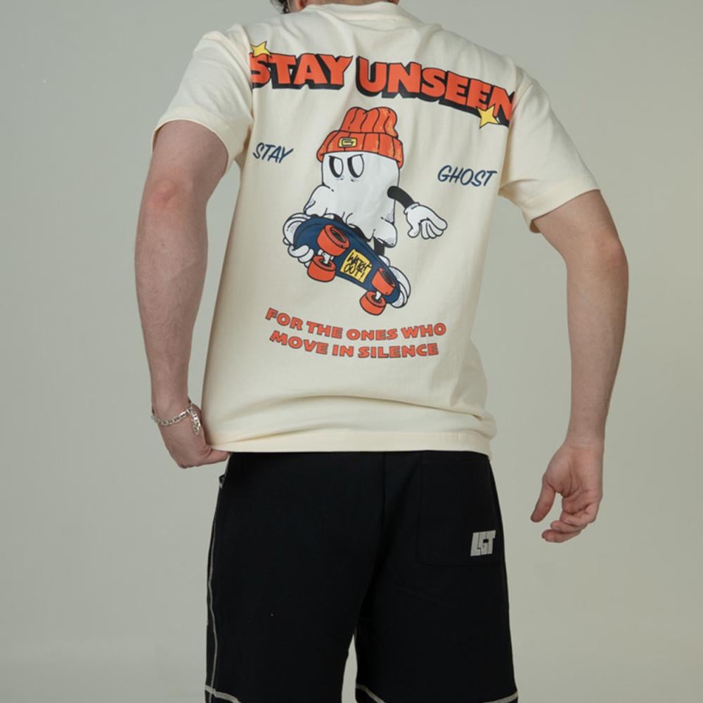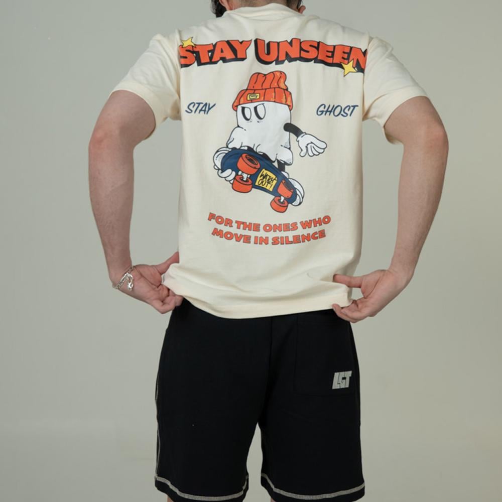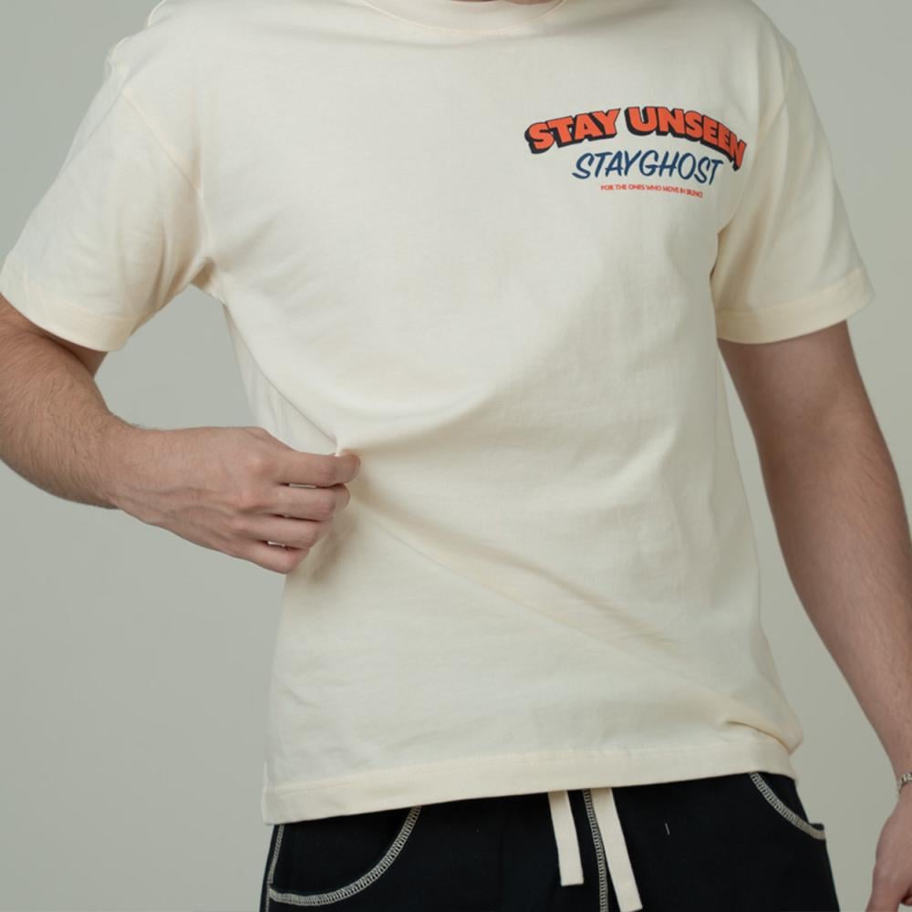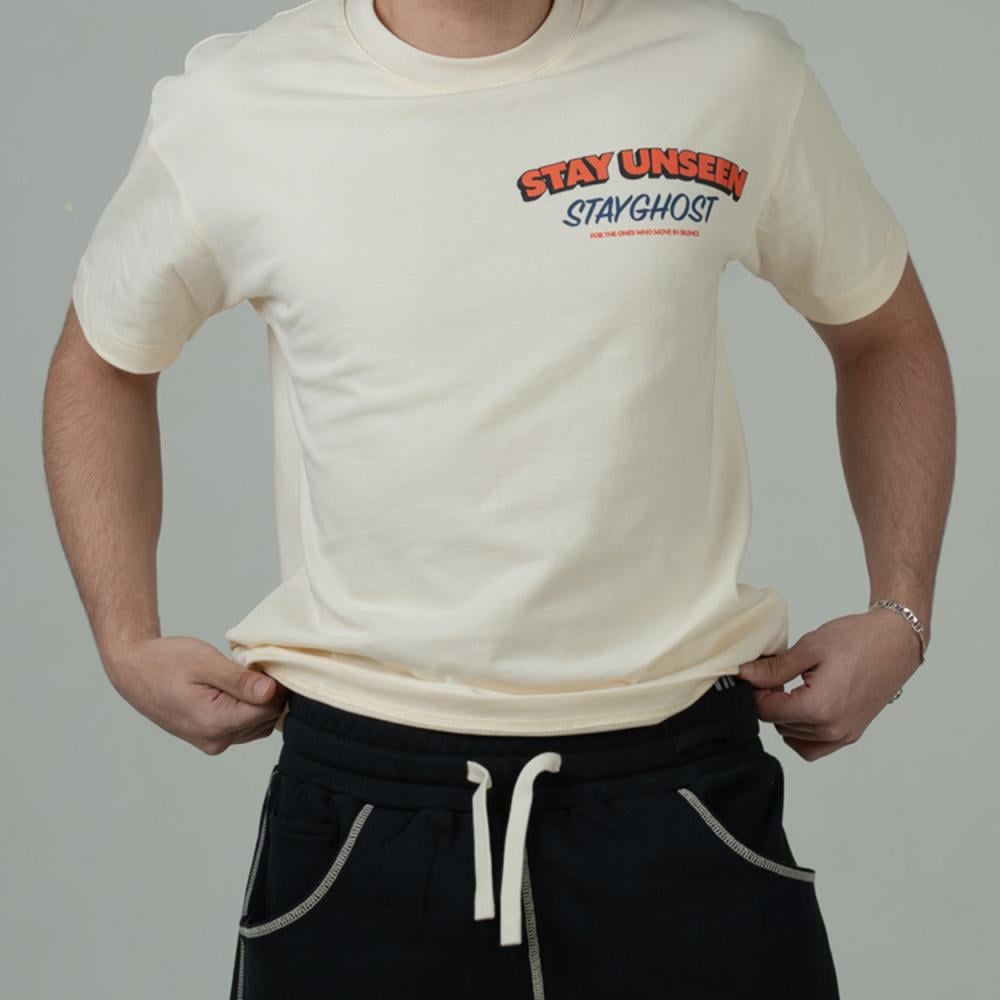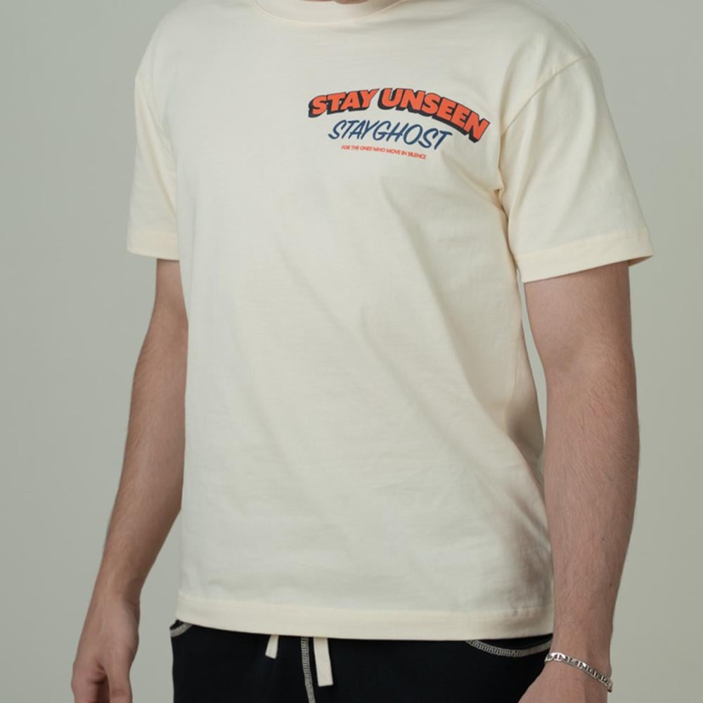 تيشيرت كريمي بتصميم ڤينتج فني، يدعوك للتحرك بخفة وهدوء مثل الشبح، موجود لكن غير مرئي